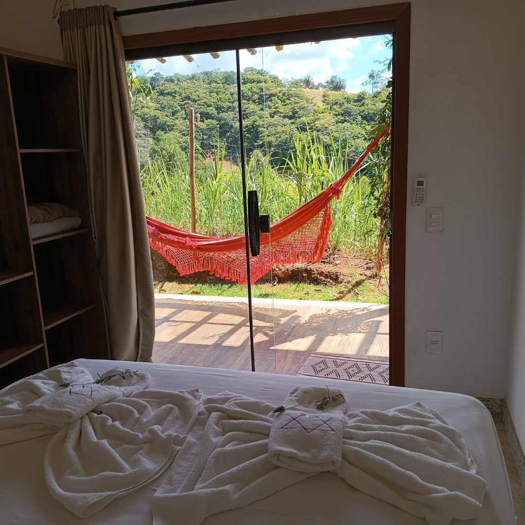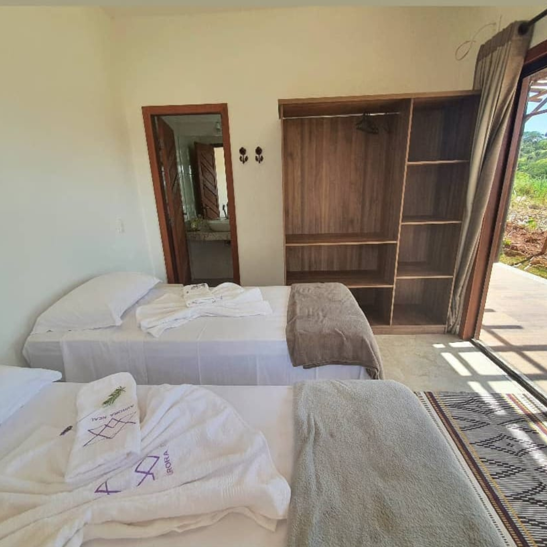 Aqui no Espaço Aurora Real, o acolhimento é realizado em aconchegantes suítes com ar-condicionado, camas box, que podem ser organizadas em duas camas de solteiro ou uma cama de casal, além de uma vista exuberante para a Serra do Espinhaço.